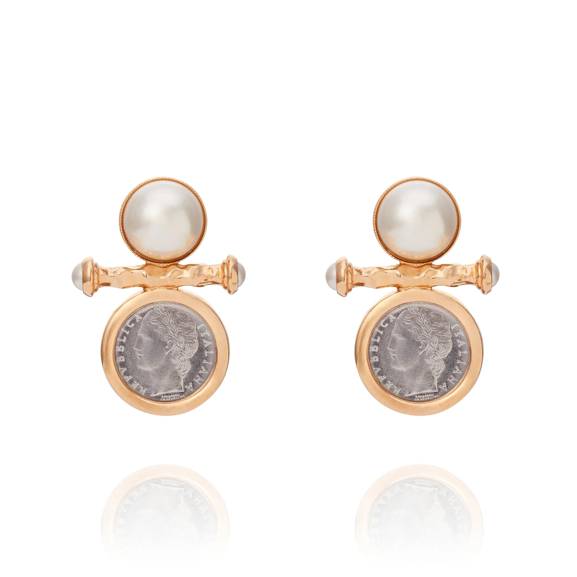 The Allora Earring is an exquisite blend of vintage charm and modern sophistication. Featuring authentic Italian lira coins framed in a warm gold-tone setting, this earring captures a piece of Italian history. The luminous pearl stud and delicately textured bar with pearl accents enhance its timeless appeal, making it a versatile addition to any jewelry collection.