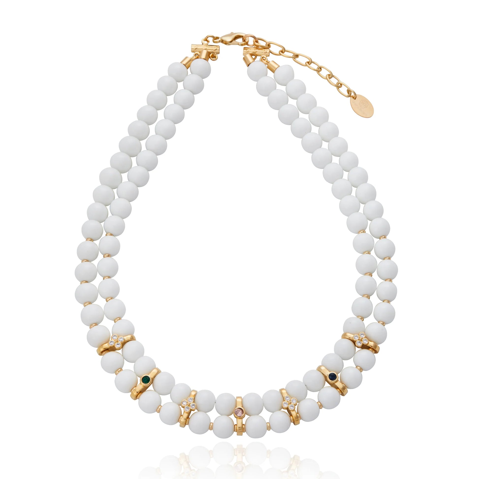The Palazzo Grassi Necklace in White Agate is a true embodiment of elegance and refined charm. Featuring two rows of smooth white agate beads, this necklace is adorned with gold-plated accents set with delicate crystal details, including touches of green and black stones for a subtle yet sophisticated contrast. The opulent design draws inspiration from the rich heritage of Venetian artistry, offering a timeless piece that complements both formal and casual ensembles.