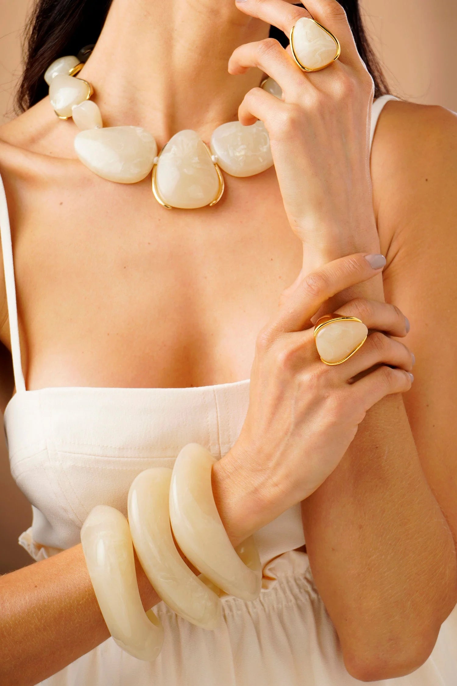 If your wish is to make an impact, definitely go with the Organic Concept Resin Necklace. It’s the perfect piece to create beautiful looks at the beach. Stack with other styles from the same family to create one beautiful combination.